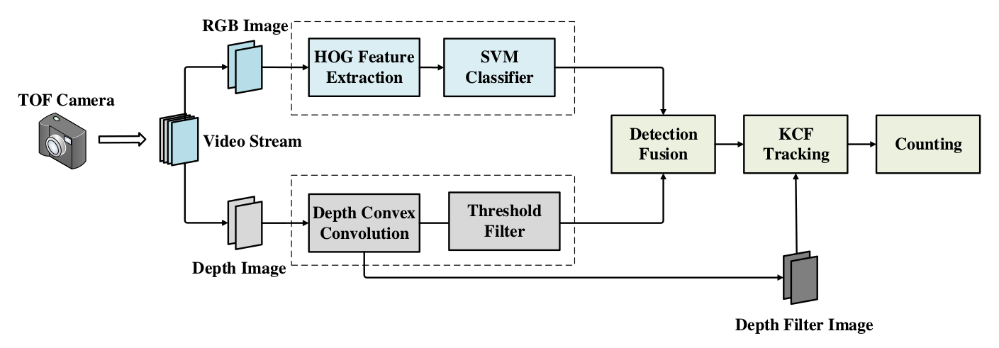 对于RGB图像,该系统首先提取出图像的HOG特征,方向梯度直方图(Histogram of Oriented Gradient, HOG)特征是一种在计算机视觉和图像处理中用来进行物体检测的特征描述子。它通过计算和统计图像局部区域的梯度方向直方图来构成特征。提取出HOG特征以后,使用先前训练好的支持向量机进行分类,从而完成对人头的识别。