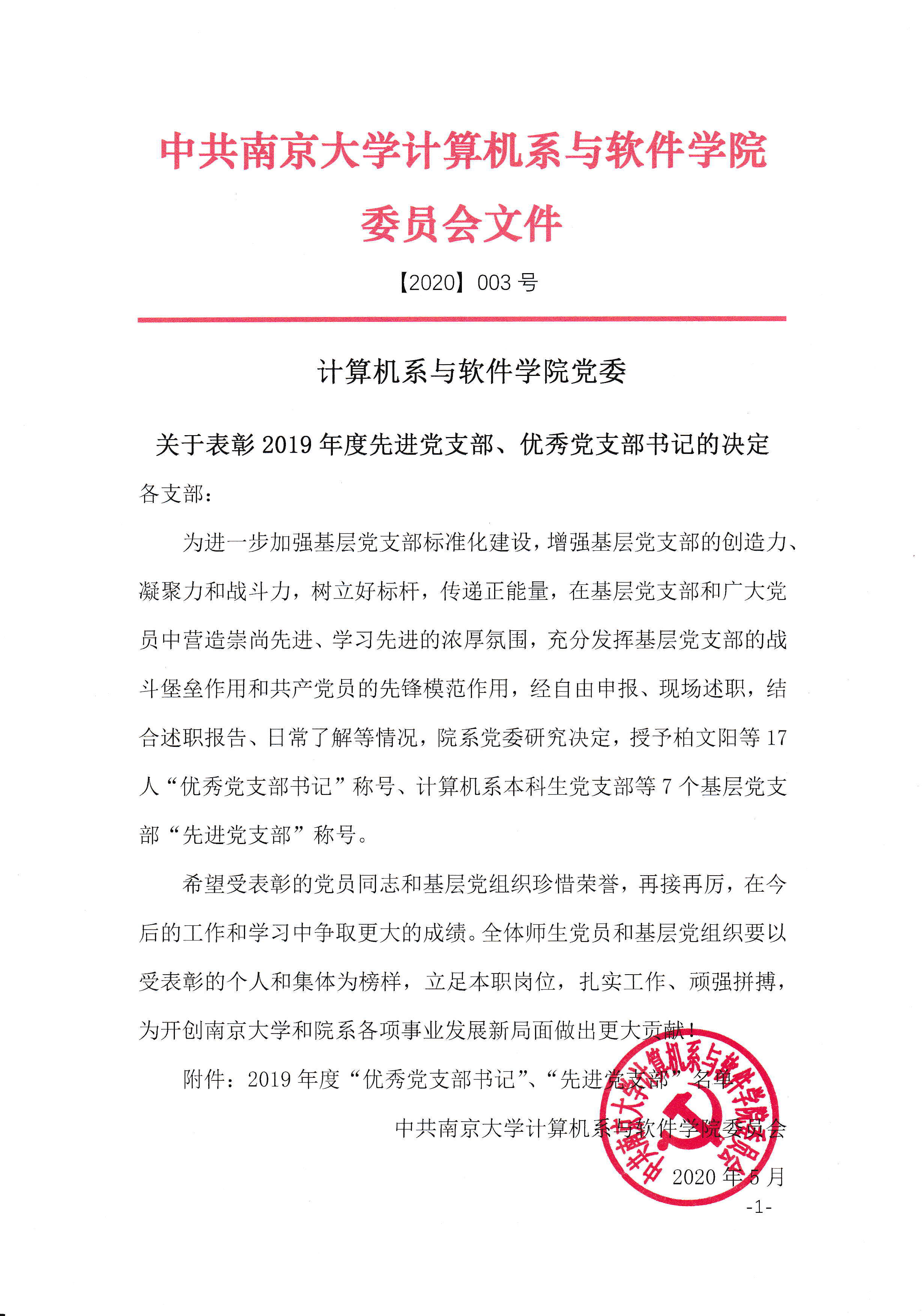 关于表彰2019年度优秀党支部书记、先进党支部的决定