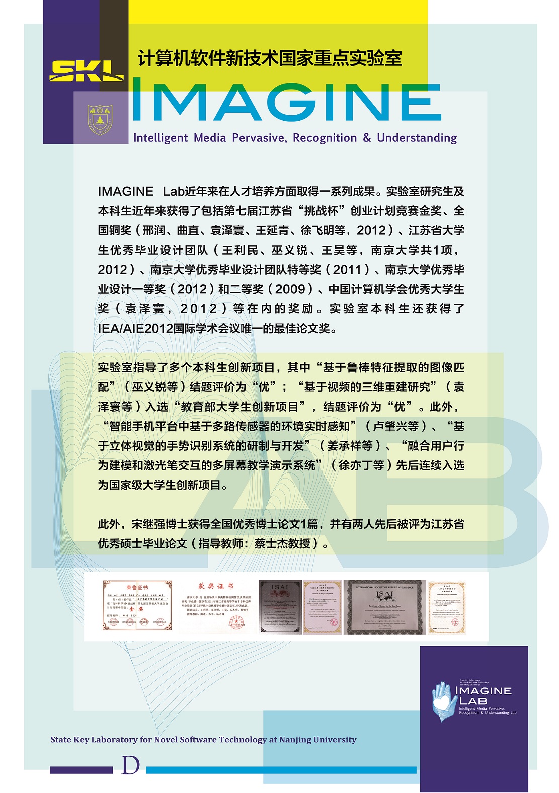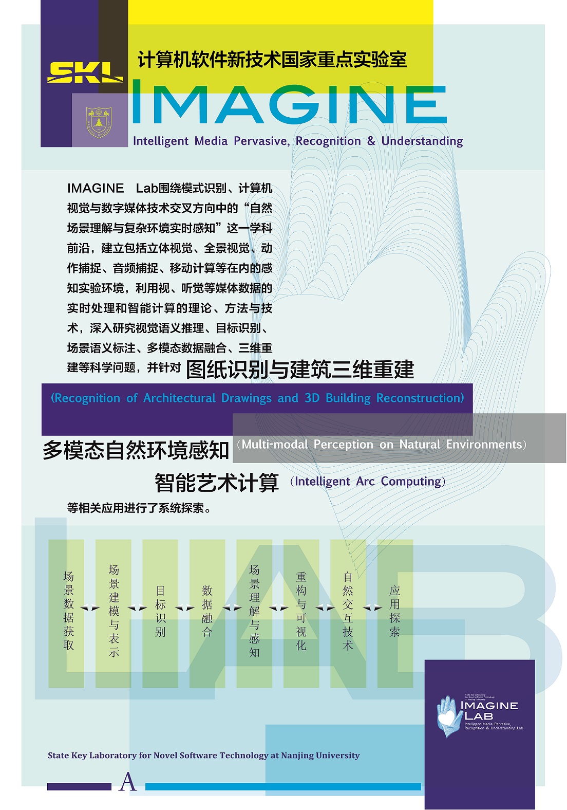 IMAGINE (Intelligent Media pervAsive, recoGnItion & uNdErstanding) is a lab established at at Nanjing University, China. The targets of IMAGINE lab include both algorithm/theory exploration and real-life systems developing. We believe automatic understanding and visualizing the content of everyday real (big) media data stream is one of the fundamental challenges in computer science, and significant advances will be made over the next few years by combining the state of the art knowledge representations and machine learning or statistical modeling techniques on big multimeida data from Internet.