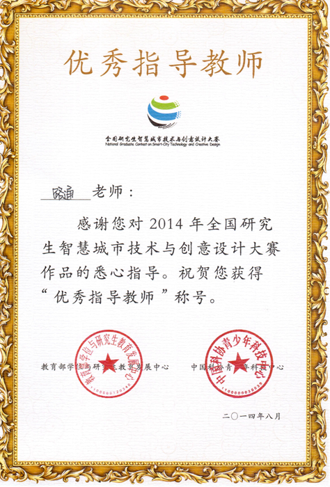 2. Prof. Lu was awarded the Excellent Supervisor in National Intelligent City contest for graduate students in China, 2014