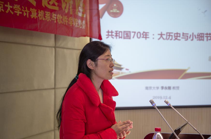 为进一步深入开展“不忘初心、牢记使命”主题教育活动,教育引导党员同志明确使命担当,2019年12月4日,计算机系与软件学院党委特邀南京大学党委理论讲师团授课专家、南京大学政府管理学院李永刚教授,以“共和国70年:大历史与小细节”为主题,为计算机系全体师生党员讲授专题党课。本次活动由系党委副书记宫玲琳老师主持,计算机系全体师生党员到场参加。