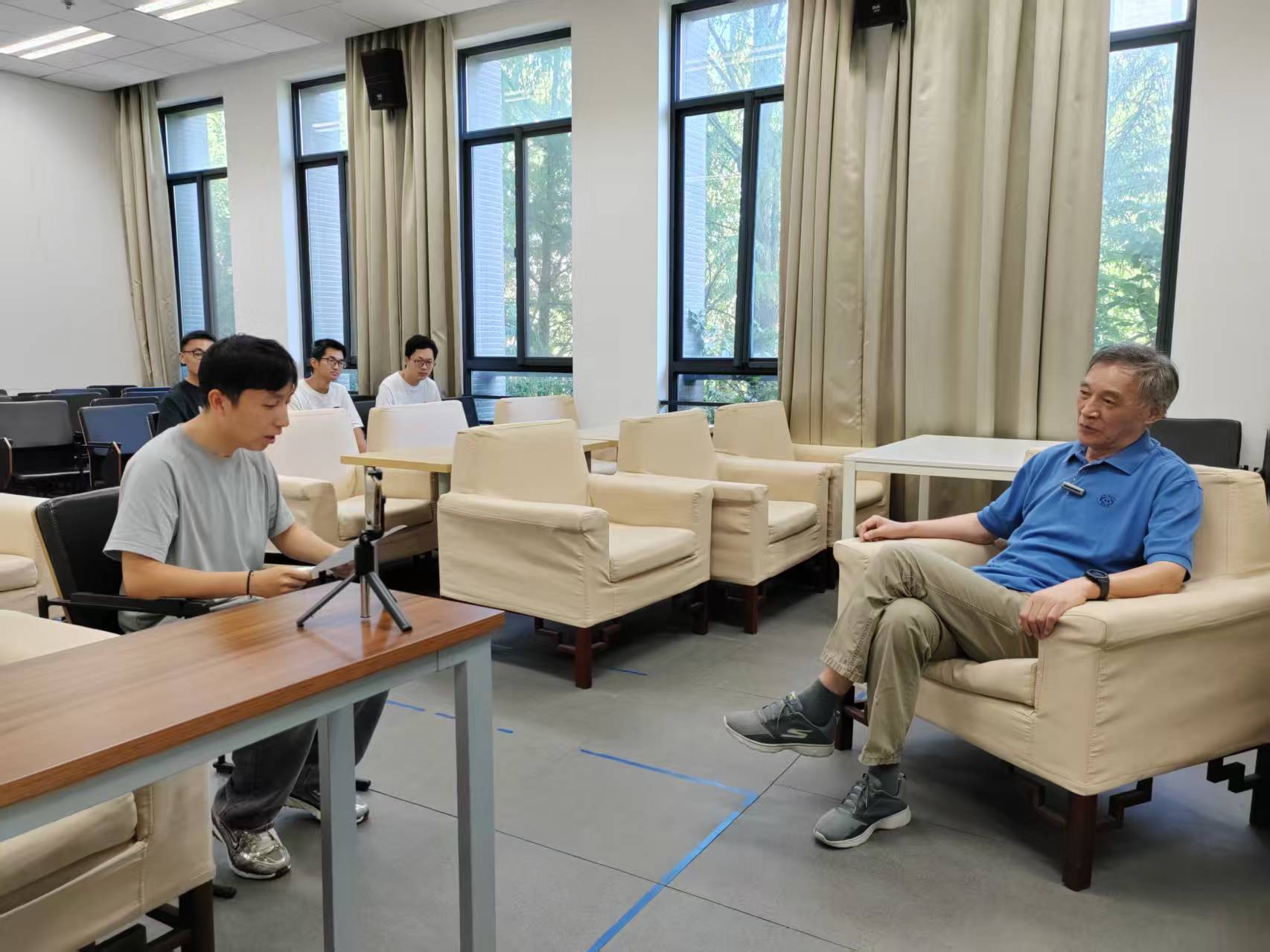 八月中旬,立秋虽过,暑气未消,天地间仍蒸腾着盛夏的余威。上午九时半,陈道蓄教授冒着酷署从住居的龙江小区专程乘坐一小时的地铁赶到仙林校区计算机楼219会议室接受釆访。访谈由学院2021级本科生刘博石主持,2023级本科生林雨昕协助拍摄,学院关工委副主任潘金贵教授以及在职青年教师过洁副教授和六名暑假在实验室加班的研究生全程参加了眝听学习。