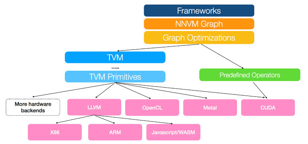 经过编译,模型需要部署在实际的硬件上。仅仅使用GPU对深度学习进行加速已经不能满足人们的需求,各种深度学习专用芯片被设计出来来对模型推理做进一步的性能提升。比如,利用FPGA可编程的特性,对新的体系结构快速做原型测试,提升深度学习的算子运算速度。