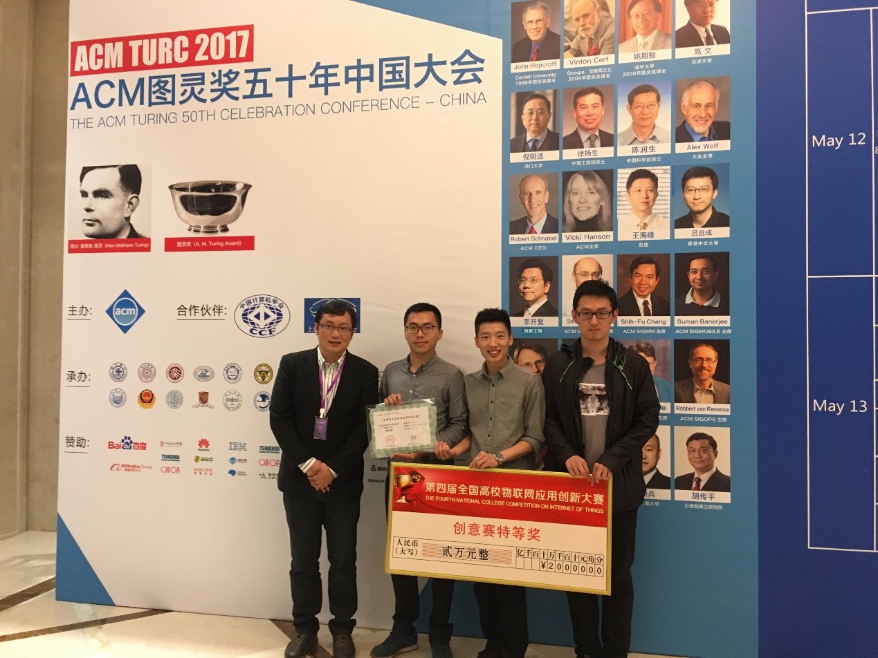 2017年5月12 – 14日,由教育部科技发展中心主办的第四届全国高校物联网应用创新大赛创意赛全国总决赛在东华大学图文信息大楼第一报告厅成功举办。我系分布式计算团队(成员:何兵兵,张柯岩,陆逸嘉;指导教师:谢磊)凭借“RF-iCare:基于RFID技术的输液监测系统”,从全国七大赛区1050只队伍中脱颖而出,获得第1名的优异成绩,夺得创意赛全国特等奖。我系团队(成员:孙珂、凌康;指导教师:戴海鹏)凭借“基于超声波的手势感知与追踪”的项目夺得总决赛第2名和一等奖(其中特等奖一名,一等奖三名,二等奖六名)。谢磊和戴海鹏作为团队指导教师分别获得最佳指导教师奖。在ACM图灵奖五十年中国大会的庆功晚宴暨赛事颁奖典礼上,图灵奖获得者、互联网之父Vinton Cerf和教育部科技发展中心李志民主任参与颁奖典礼,并颁发特等奖和最佳指导老师奖奖牌。出席者还包括图灵奖获得者John Hopcroft,ACM主席Vicki Hanson,ACM Fellow、IEEE Fellow、清华大学软件学院院长刘云浩等。此次总决赛的参赛队伍共有从七大赛区选拔出来的包括南京大学、清华大学、武汉大学、哈尔滨工业大学、华中科技大学、西安交通大学等在内的42所高校75支参赛队伍。