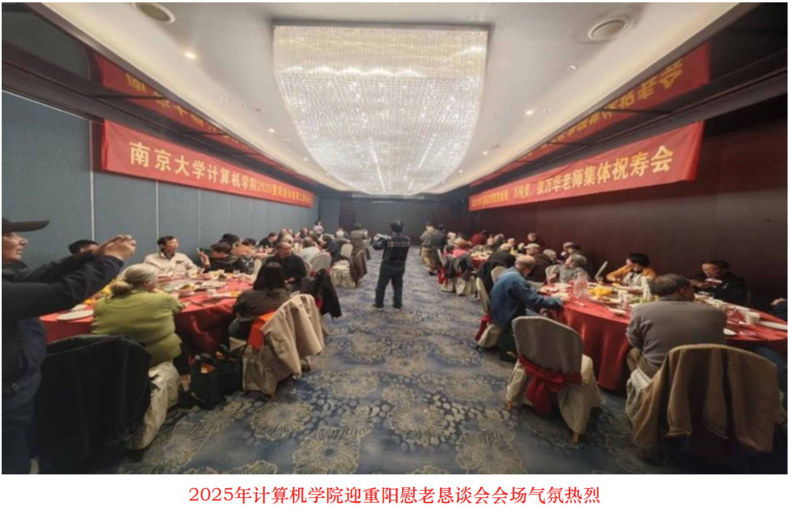 传承敬老之风,共叙桑榆之情。举办敬老慰老活动,是计算机学院多年来坚守的优良传统。10月28日,重阳节前夕,恰逢金陵满城丹桂飘香的斑斓时节,今年的慰老恳谈会在龙江阳光广场老广东酒家温馨启幕。活动现场暖意融融,50余位退休老教师欢聚一堂。其中既有原学科带头人,也有贺威顺、张万华等 80 岁及以上的高龄老同志,大家共话往昔、畅谈今朝。