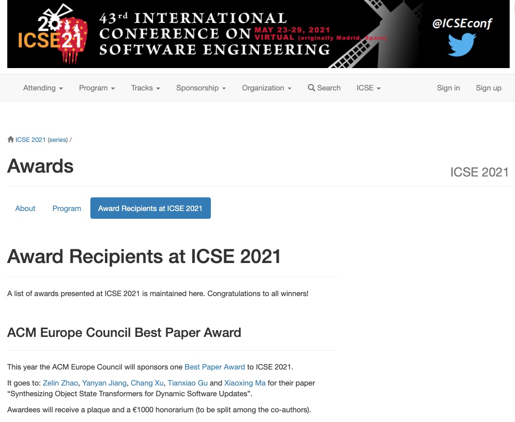 近日,国际软件工程大会(International Conference on Software Engineering, ICSE)官方网站公布大会奖项,南京大学计算机软件所团队的论文《Synthesizing Object State Transformers for Dynamic Software Updates》获得了由ACM Europe Council支持的大会唯一最佳论文奖(Best Paper Award),并获1000欧元奖金。该论文同时也获得了ACM SIGSOFT杰出论文奖(Distinguished Paper Award)。